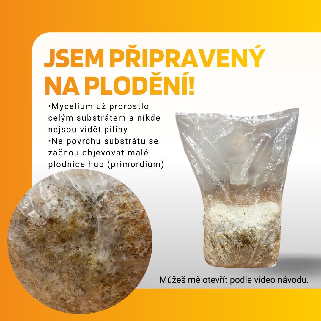Péče: Kvůli teplu však rychle ztrácí vlhkost. Je nezbytné substrát HODNĚ rosit – ideálně 8 až 10krát denně. Vysoká vzdušná vlhkost je pro formování plodnic naprosto klíčová.