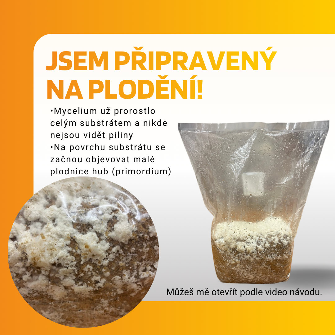 Umístění: Umístěte blok na stinné, ale světlé místo (nepřímé světlo) s vyšší vlhkostí (např. chladnější kuchyně, koupelna nebo sklep). Ideální teplota pro plodění je 15 – 20 °C.